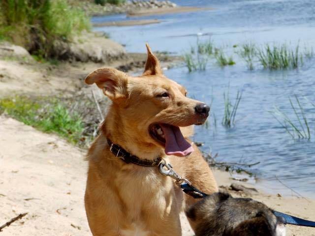 Rodi, ok 3 letni pies. Sierść beżowa krótka. Waga ok. 15 kg, wielkość do kolana.